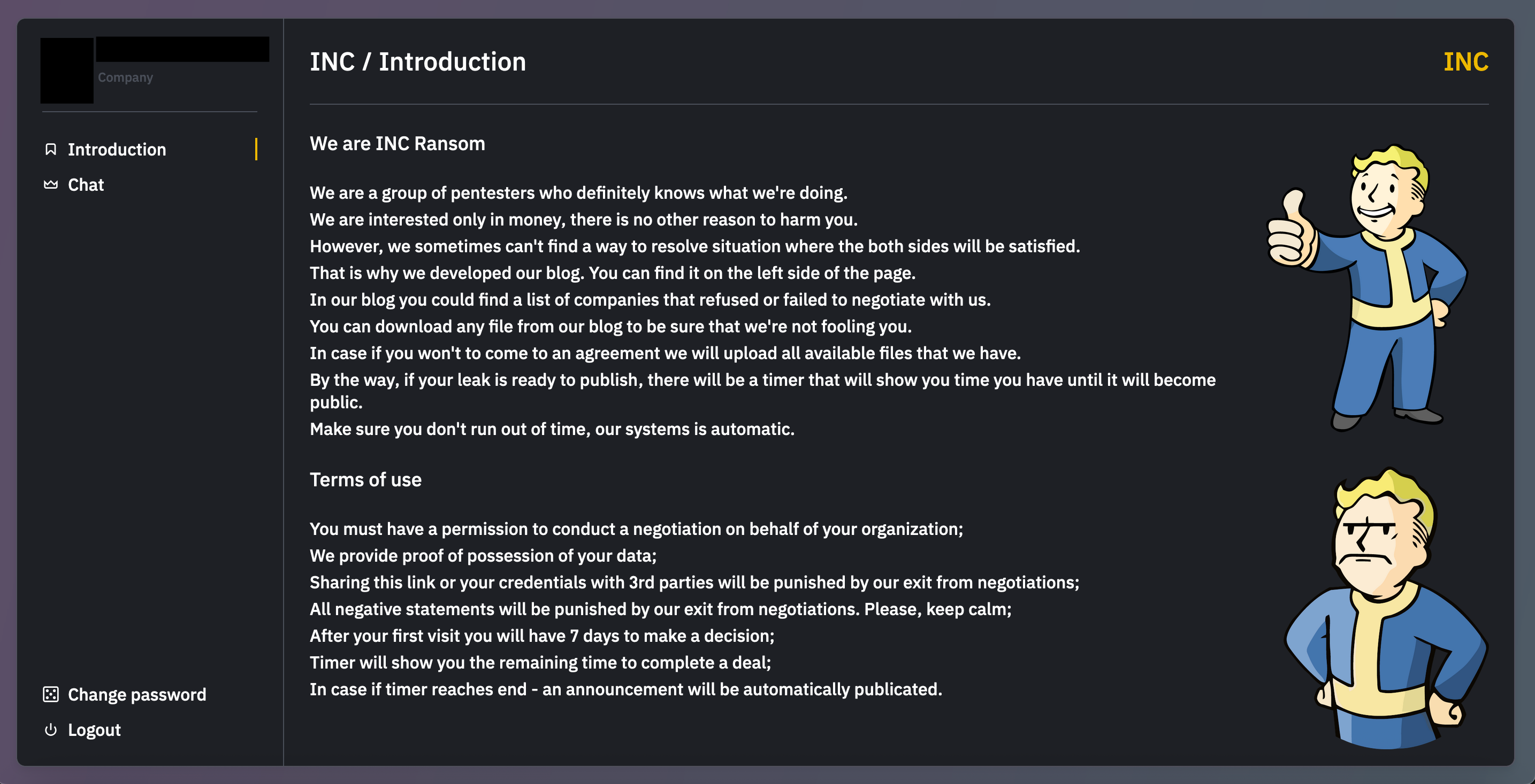 Ransom notes replace desktop wallpapers and are dropped on encrypted systems in both HTML and text formats (INC-README.HTML and INC-README.txt). Notes can also be printed physically using available printers. Each note includes a link to the ransom negotiation portal and a unique victim ID. Victims use this ID to register on the portal, where they are presented with an introduction to the INC operation. The tone is direct and unapologetic, framing the attackers as “penetration testers” motivated solely by money. The message references the group’s leak site to reinforce credibility and increase pressure during negotiations.